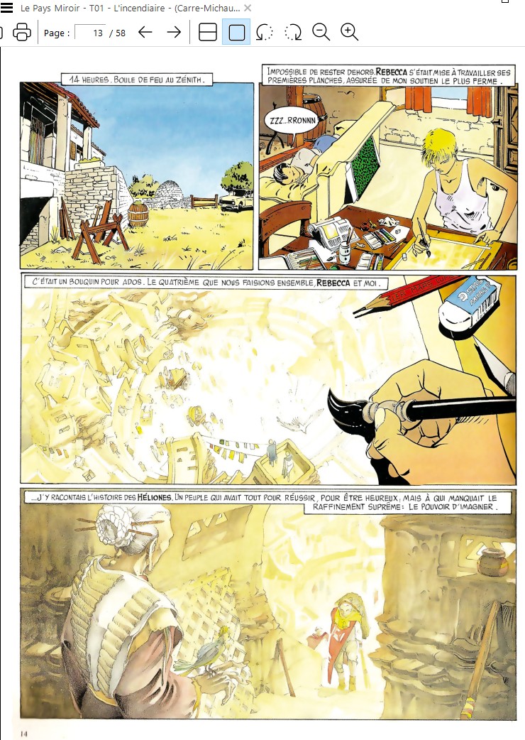 Par contre, les extraits de la bédéthèque ne permettent pas de vérifier si il y a bien des variations dans le style de dessins pour représenter les 2 mondes au sein d'une même BD.