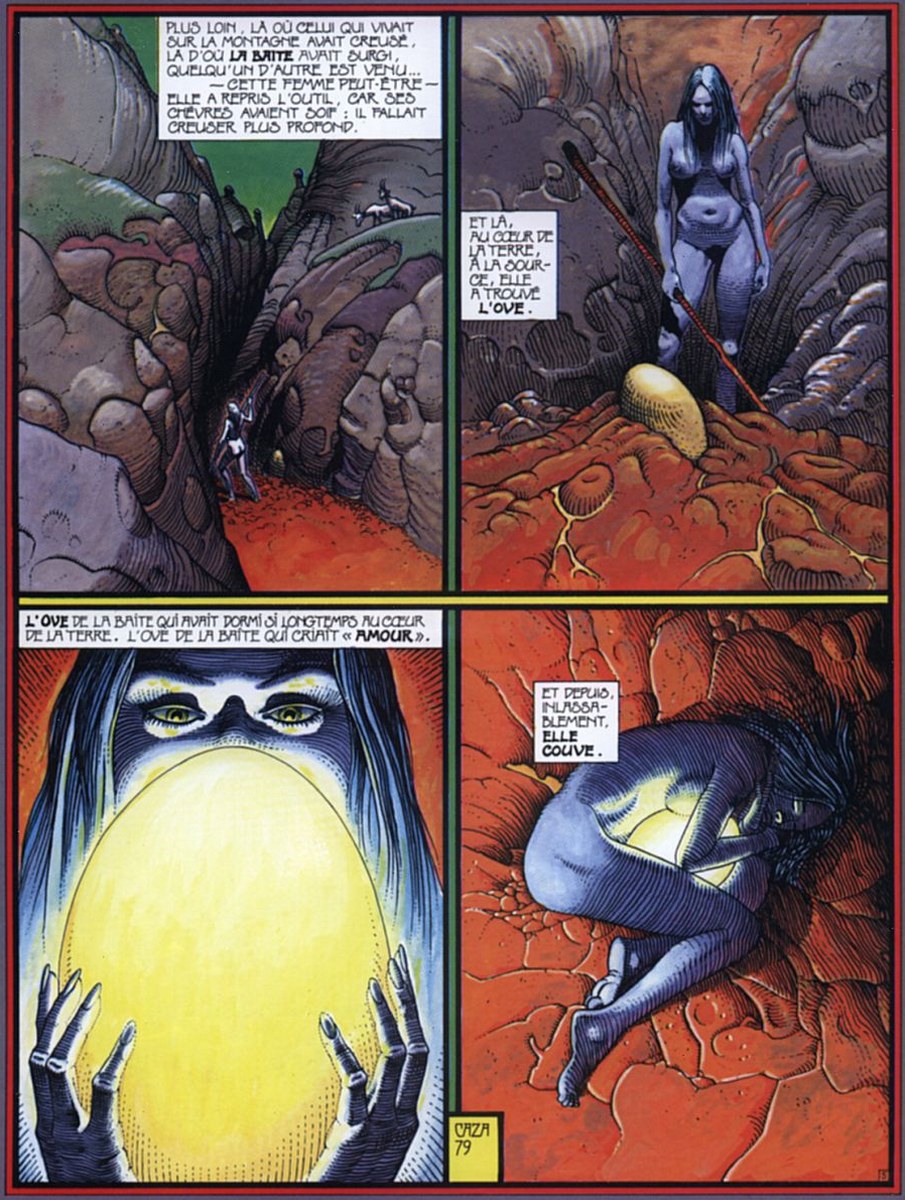 – dernière planche très marquante : une femme allongée sur le côté, au centre d’un petit cratère, tenant dans ses bras un gros œuf, avec une bulle disant quelque chose comme :