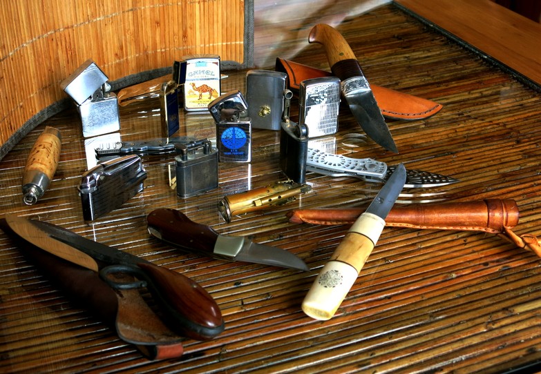 Échantillon des collections de briquets et couteaux de mon homme... J'avais aussi l'option des vieux outils, mais j'ai eu peur des araignées...