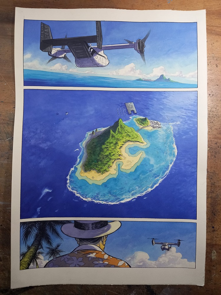 J-M. A : Pigalle 1950, c’est un projet abouti qui va paraitre. Ce ne sera pas un grand format mais comme celui d’Est Ouest. Il y aura aussi ensuite L’Île des riches toujours avec Pierre Christin chez Dupuis. Ce n’est pas un polar mais un huis-clos sur une île du Pacifique. On ne va pas en dire plus, suspense oblige. Je le démarre à peine. J’ai modelé une île. Ce sera en couleur et il me faudra un an et demi. En grand format avec 80 à 100 pages.