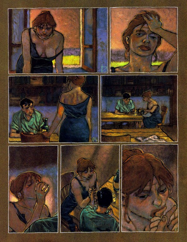 Trait De Craie... la moitié des planches me font chavirer, surtout que la couleur du papier change au fur et à mesure de la météo et de l'heure qui passe (à ce niveau-là, la parution dans (A Suivre) était encore plus fantastique parce qu'il n'y avait pasle bord bland dans le bouquin).