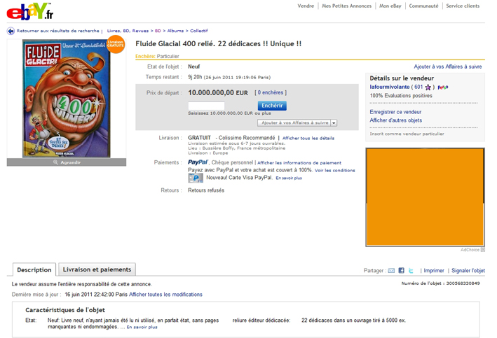 johnkalak a écrit:Si une enchère est manifestement très largement supérieure à la valeur théorique d'un objet je pense que ça annule de facto la vente. (je parle de valeur tellement énorme qu'elles sont absurdes).