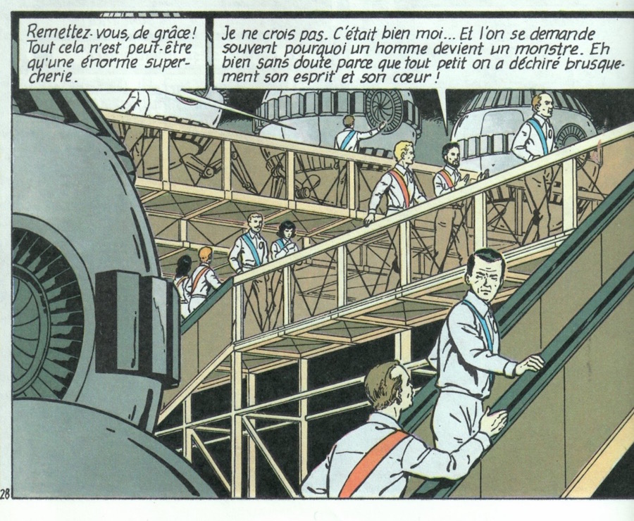 A gauche, il s'agit de la maquette du projet d'avion de chasse Pa.112 C1, réalisée à partir de la cellule de l'avion de course Pa.100/101 qui avait fait des survols en ligne droite d'aérodrome en 1935 (arrêtés suite au fauchage du train d'atterrissage du Pa.101 et à l'absence de moyens financiers du constructeur pour le réparer). Visiblement l'armement d'aile du TJ Arès (si c'est bien son nom) de l'album Le scandale Arès est inspiré de celui prévu pour le Pa.112 C1.
