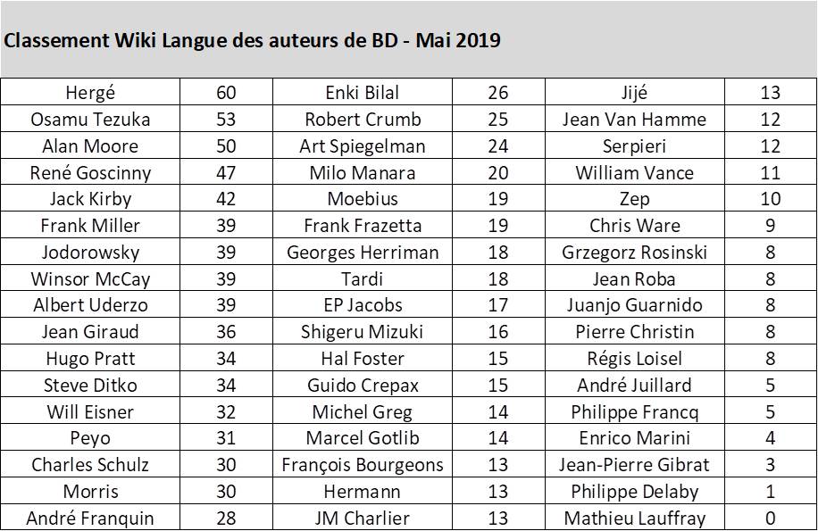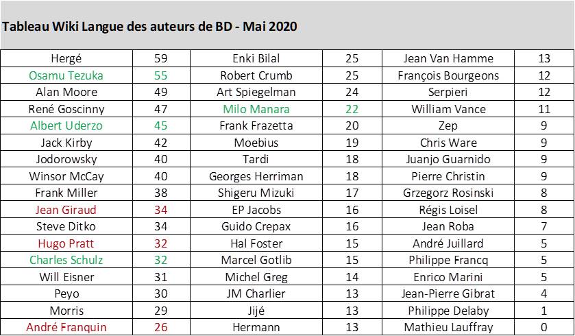 Tu as raison, le chiffre que je marque est celui des langues additionnelles, il faut donc ajouter +1 partout (ouf pour Lauffray PotdeNutella a écrit:...Et pour Moebius, tu peux le virer : il s'agit de la page d'homonymies qui référence tout ce qui porte ce nom. La page de l'artiste Moebius n'existe pas, il n'y a que celle de Jean Giraud.