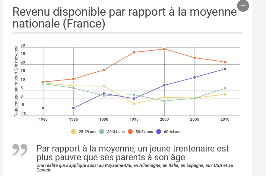 https://infogram.com/untitled-1gqnmxjwz3drplwon s'aperçoit que, depuis 1980, les jeunes (moins de 34 ans) se sont appauvris et qu'au contraire, ce sont les "boomers" qui se sont enrichis.