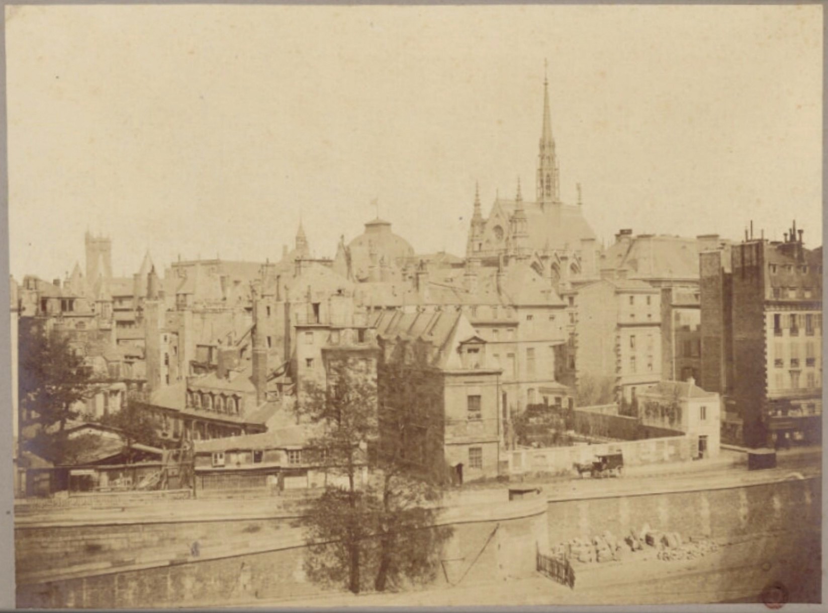 Photo qui à mon avis sert de base au dessin, avec d'autres documents consacrés au Quai des Orfèvres, comme par exemple cette vue photographiée par Doucet en 1848, avant la construction de la Préfecture de Police à côté du petit bâtiment au toit pointu du premier plan (à gauche sur la case).