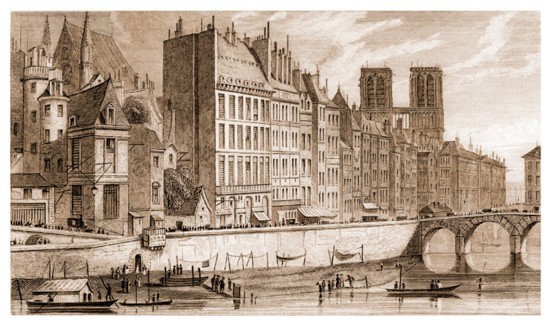 En guise d'introduction, nous découvrons une vue de l'Île de la Cité, avec l'ancien pont Saint-Michel, avant sa destruction en 1857