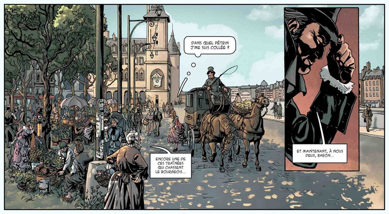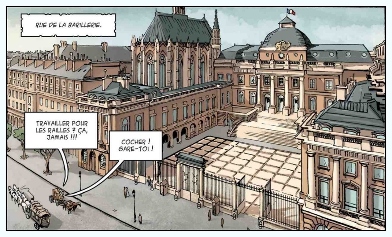 Je veux bien admettre que le dessinateur n'est pas Corot non plus, mais là l'inspiration est carrément partie en fumée ! C'est quoi ce choix de couleurs pas du tout fidèles ? On dirait plus une vue moderne de quais de Saône lyonnais qu'un panomara du Paris du XIXe...
