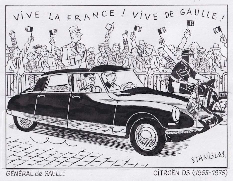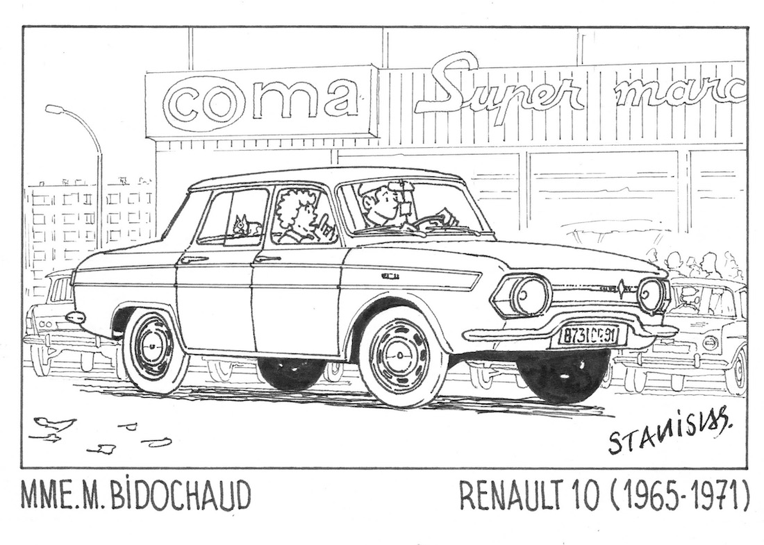 L’Austin A40 Dorset de Blake et Mortimer, Renault 4CV de Victor Levallois, Lancia Aurélia de Georges et Germaine Remi, Mercedez-Benz 300SL de Sophia Loren, Vespa 400 de Bonjour Tristesse, Combi Volkswagen, Citroën DS volante de Fantômas, Citroën Type C de Bécassine, Bugatti type 35, Citroën traction avant du Commissaire Maigret, parmi les 30 automobiles dessinées pour ce livre illustré qui se présente comme un voyage dans le temps à travers une sélection de films et bandes dessinées évoqués par Stanislas dans les légendes de chaque illustration.