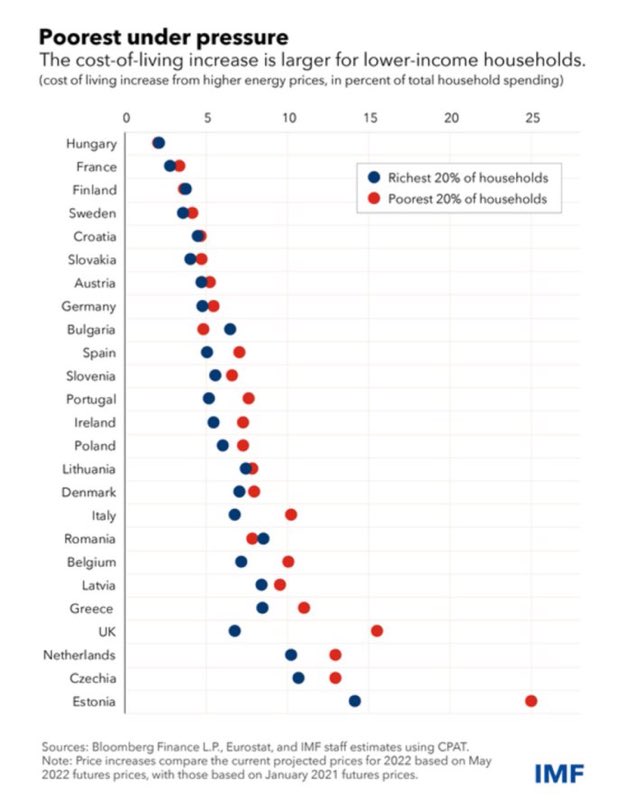 Le 3 août, le Fonds monétaire international (FMI) a publié une étude mesurant l’impact du choc énergétique pour les 20 % des foyers les plus riches et les 20 % les plus fragiles à travers l’Europe. En France, en Finlande ou en Suède, la hausse du coût de la vie est similaire pour les deux groupes, autour de 4 %. Au Royaume-Uni, elle est de 7 % pour les plus aisés et de 16 % pour les plus défavorisés. Seule l’Estonie affiche un écart aussi large.