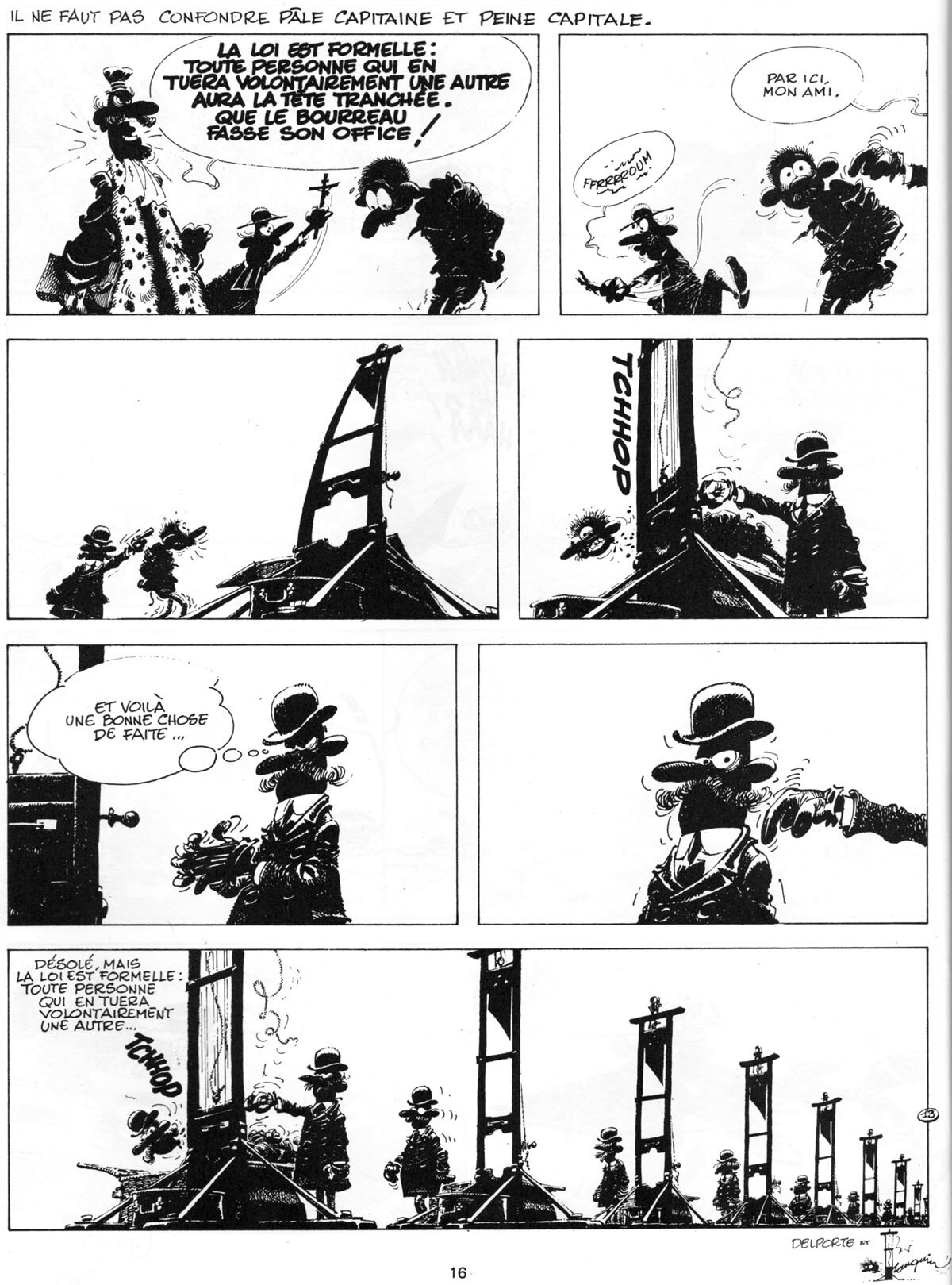 Et ce qui est encore plus agaçant c'est quand page 48, il n'y a que la première moitié du gag à la guillotine qui a été répétée en bas de page au lieu d'avoir imprimé la deuxième moitié du gag. Qu'à cela ne tienne, je cours page 188 qui reproduit le même gag, et là, patatras, même erreur d'édition. On se retrouve donc 4 fois avec les deux premiers strips du gag et jamais la fin...![]()
