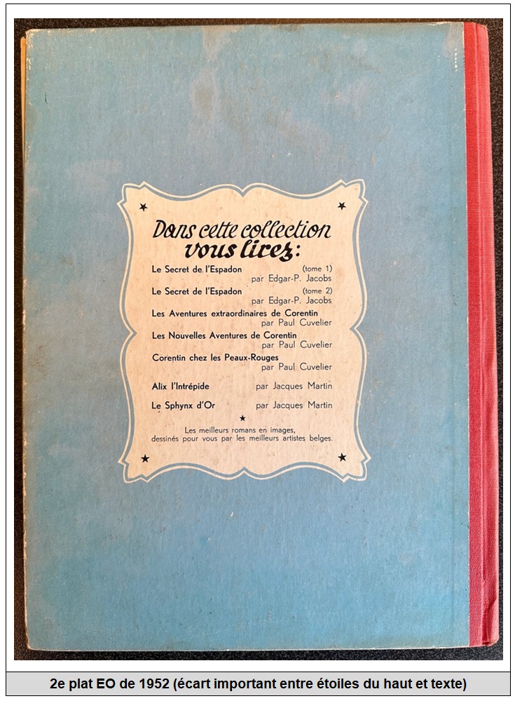 Par ailleurs, Tarente, avec son sens aigu de l’observation nous a fait part d’une différence du 2ème plat PO.3 pour l’album de Bob et Bobette, Le Fantôme espagnol, avec la présence d’un écart différent entre l’étoile du haut et le texte entre l’EO de 1952 et la réédition de 1953. Cependant, cette différence n’existe que pour la réédition ayant un dos toilé rouge mais n’est pas retrouvée pour les deux autres (dos toilé orange et marron)