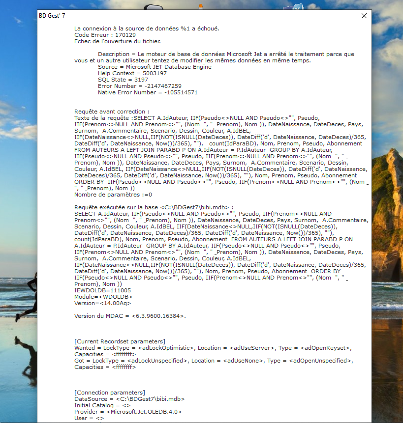 J'ai fait l'achat d'un nouvel ordi portable en window 10, j'ai transféré ma collection mais à chaque ouverture j'ai un message d'errreur :