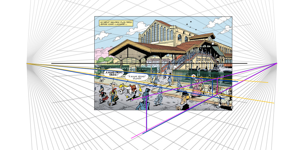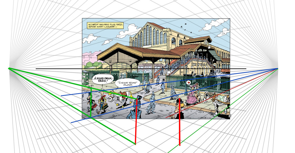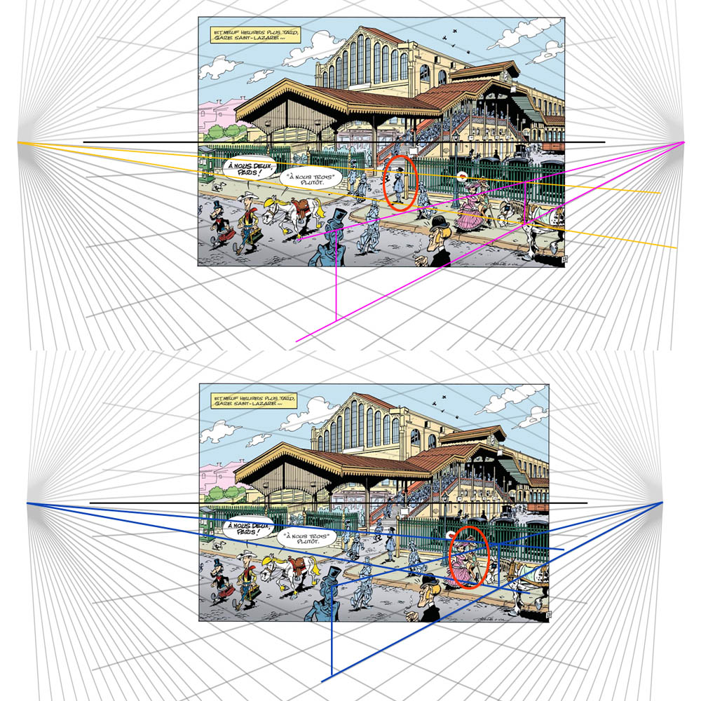Et non pas sur la bordure du trottoir. Parce que le trottoir lui s'élargit ou est pas droit, pas grave. Quant à la sortie de la gare, d'où sortent Lucky et Jolly Jumper, elle n'a pas à être aligné sur la perspective, au sens que sur le cadastre, bin non, elle est pas perpendiculaire aux grilles, mais en biais, comme beaucoup de sortie...