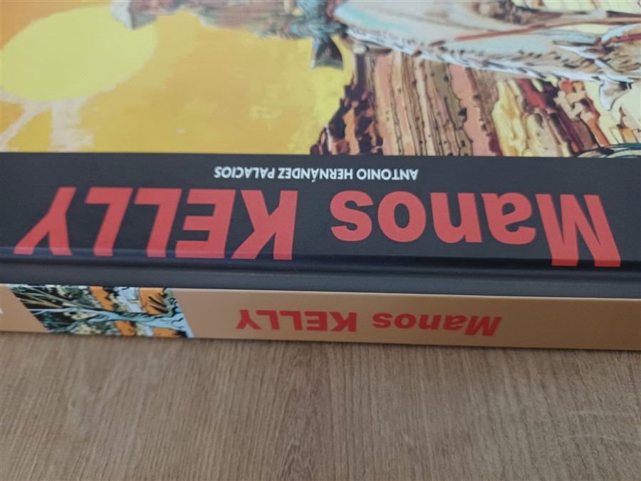 1/ De mémoire, pour le premier tirage, dans la partie gauche de la couverture qui forme une bande ou une marge avec un fond noir, le haut des lettres majuscules (par conséquent le haut du "M" de Manos et le haut de toutes les lettres du nom "KELLY") déborde de un ou deux millimètres sur le mors, lequel forme un angle d'environ 40-45 degrés (à la louche et de mémoire) avec le plat.