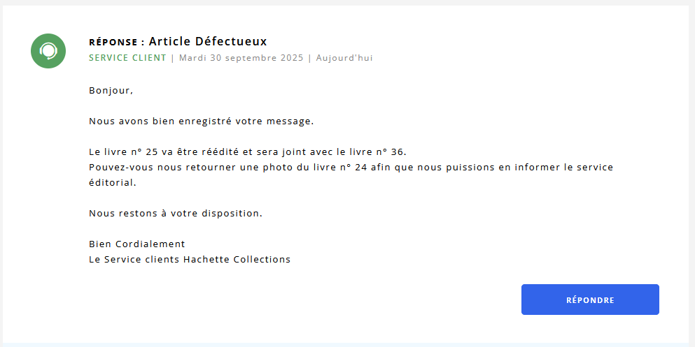 mdata a écrit:Les gens qui ont envoyé un message à Hachette, vous avez eu un retour ? Pour ma part silence radio total, donc je m'interroge...