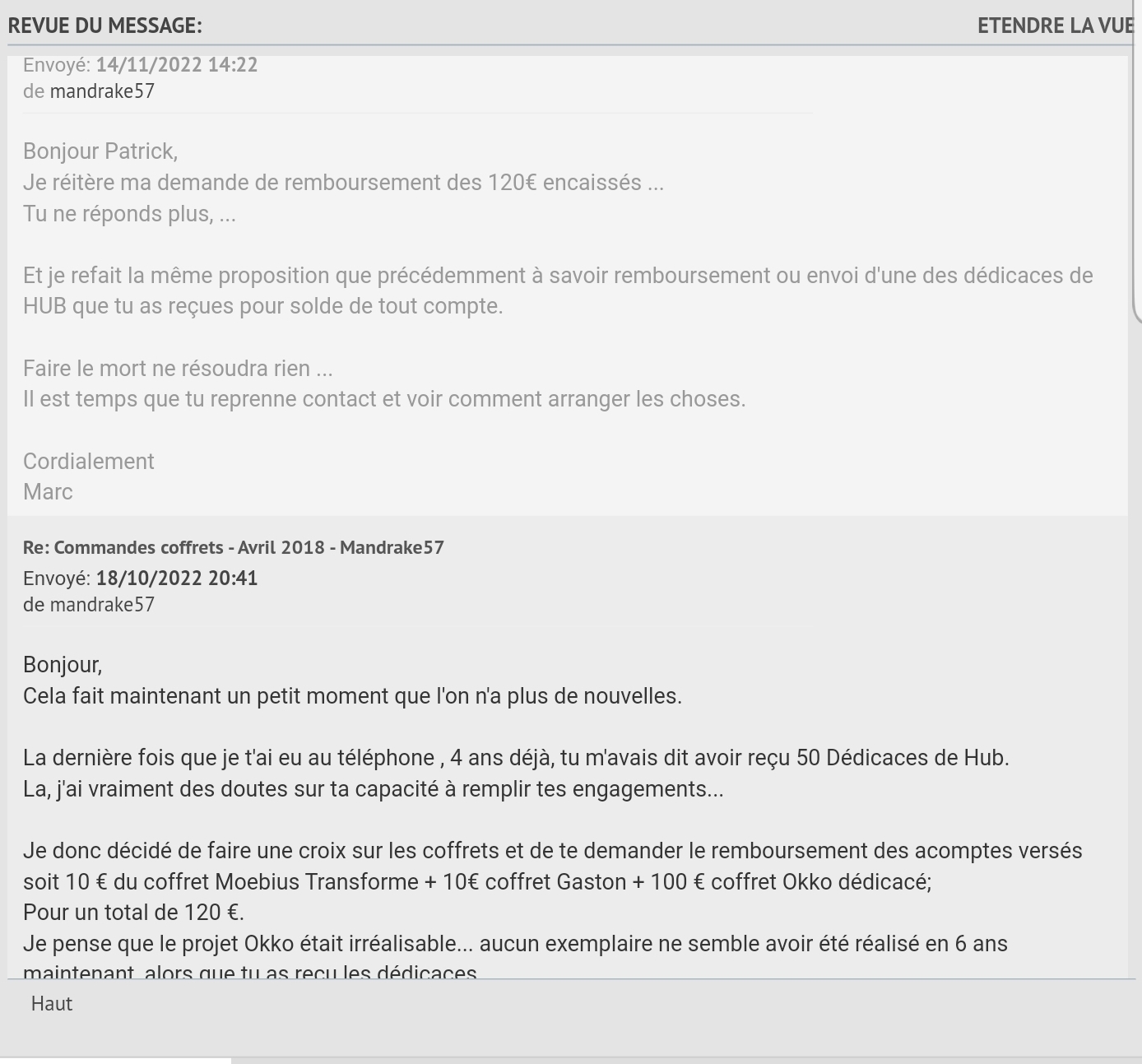 Le fait est qu'il a reçu toutes les avances et d'après ce que je comprend, on ne verra jamais les coffrets Okko... parce qu'il est soit disant délicat de relancer l'auteur ... Et il n'est pas délicat d'avoir encaissé de l'argent sans qu'il ne se se sente aucune obligation envers les acheteurs ?