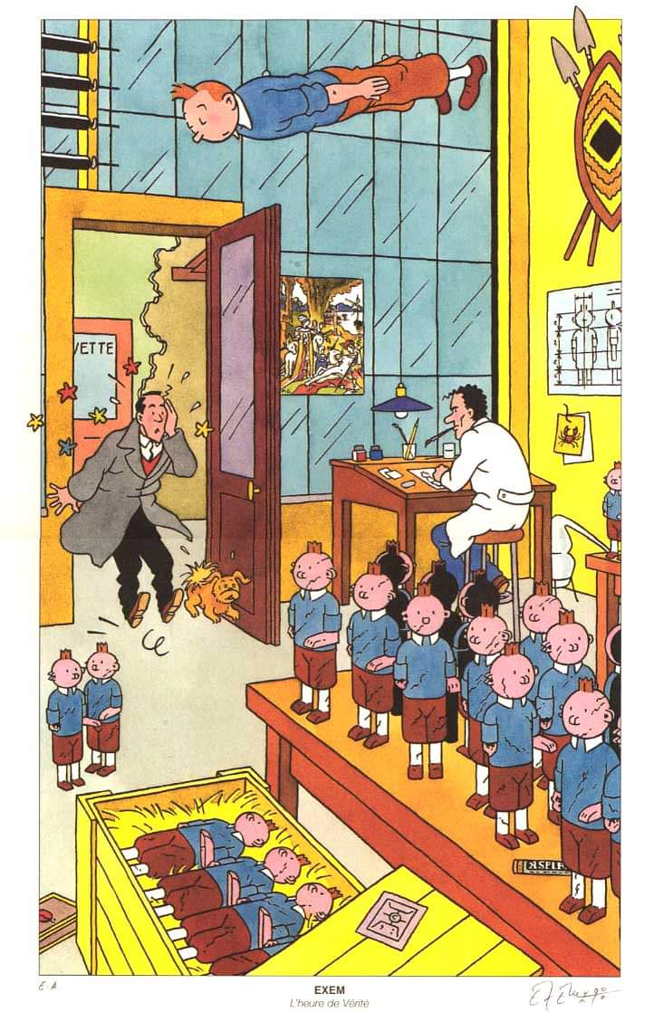 Le premier est le détournement classique, le plus souvent basé sur une homophonie, et en rapport avec l'actualité. De petites modifications au dessin ajoutent beaucoup à ces détournements (Tintin et son papier sortant du château)