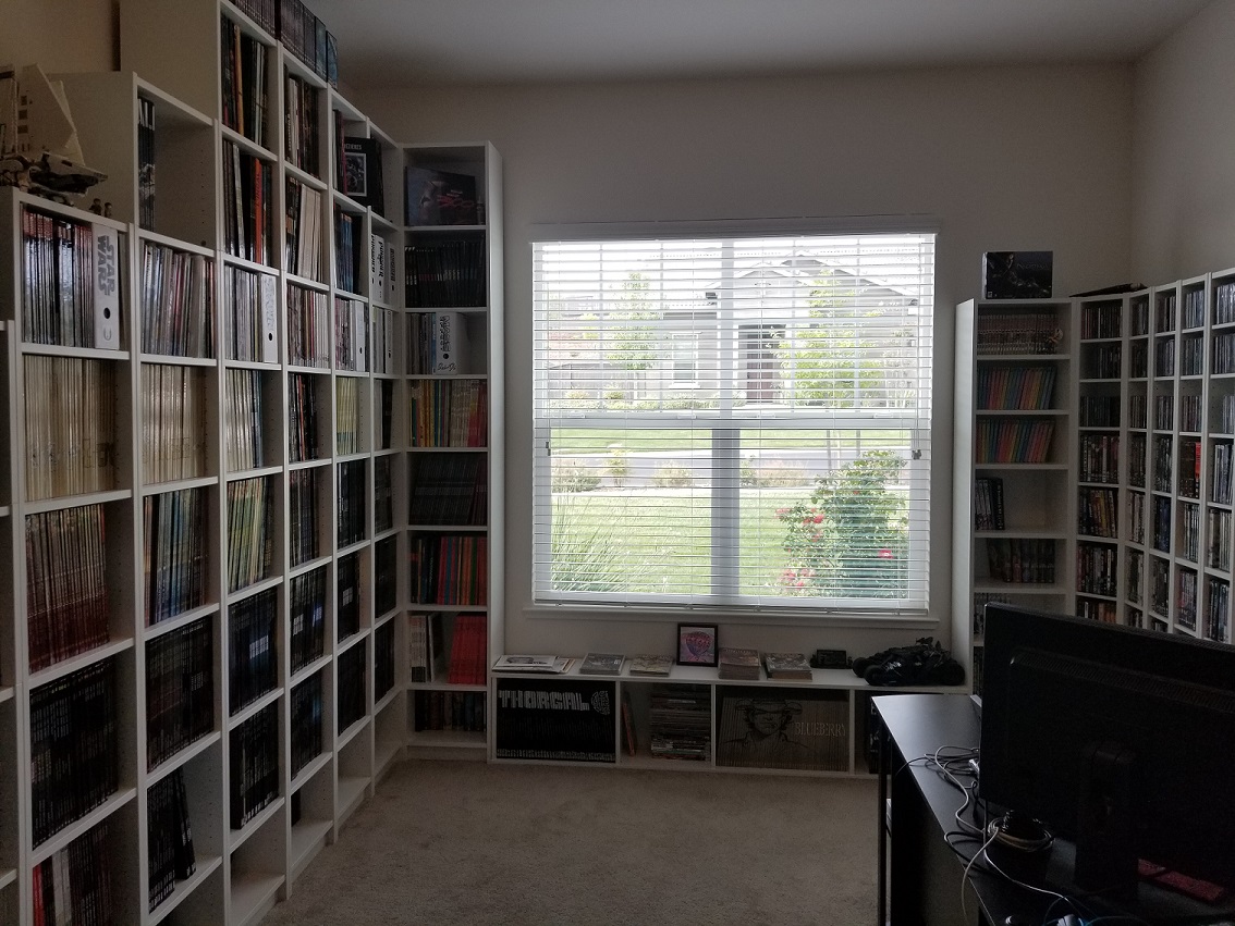 pour moi c'est en partie lié à la nature de la collection. si on a une majorité de francobelge en format classique et beaucoup de longues séries classiques, un classement par série, ou héros, est envisageable. si on a une collection beaucoup plus hétéroclite (manga + comics + one shots + séries courtes + intégrales etc ) je préconise un classement par format / collections / éditeurs, qui permet d'optimiser la hauteur des étagères pour les mangas et moyens formats.