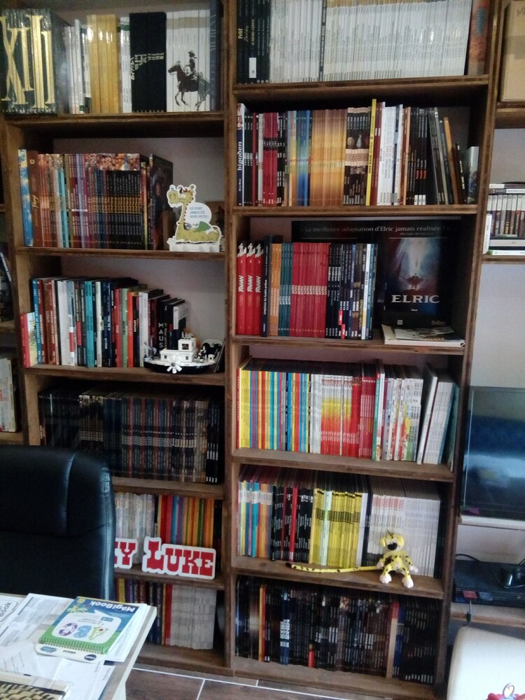 Pour répondre à toutes les questions, il s'agit d'un salon avec canapé et tv avec un mur de BD. Effectivement l'escalier est provisoire, nous n’avons pas encore trouvé notre bonheur. Et il n'y aura pas d'étagères au-dessus car ce sera inaccessible. On accède d'ailleurs aux étagères du haut par une bonne vieille échelle Ikea.