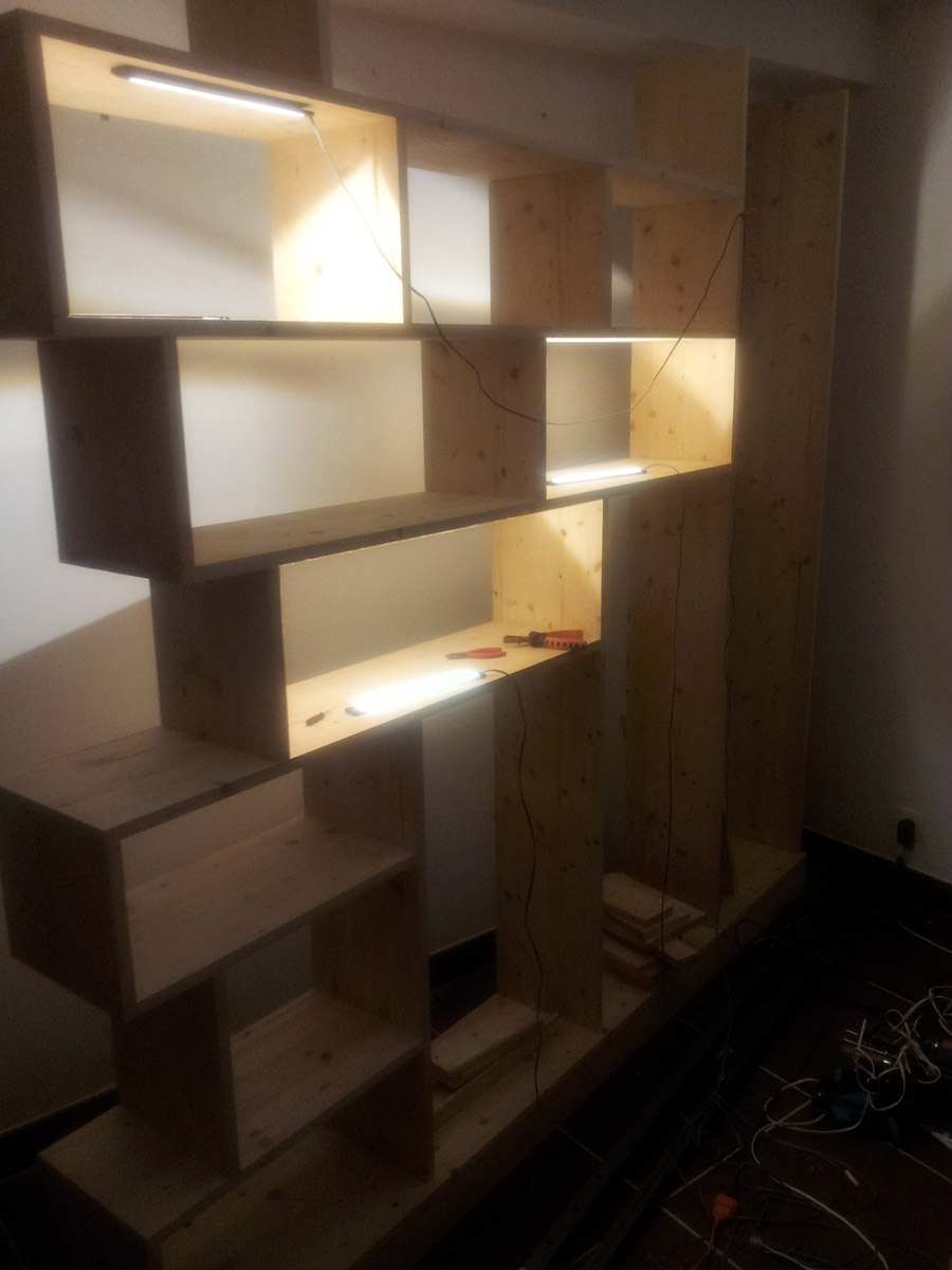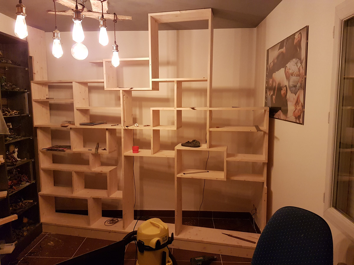Juste une question: vu le nombre de montants verticaux (pléonasme?) au complet ininterrompu fort réduit (je n'en vois possiblement qu'un seul à gauche sur la photo), est ce que le meuble prend vraiment appuis sur les murs latéraux (et p-ê même contre le plafond)?