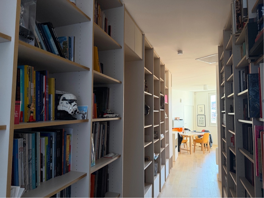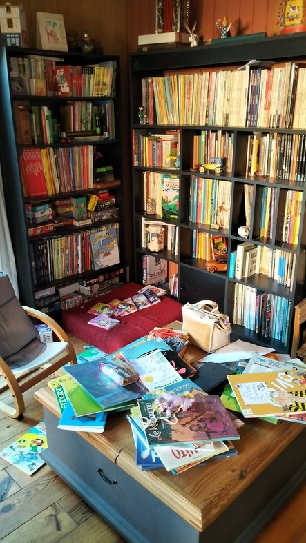 On a en bas, dans notre pièce à vivre, un coin bibliothèque à l'attention des enfants. Or, en ce moment, on a des amis en vacances quelques jours chez nous.