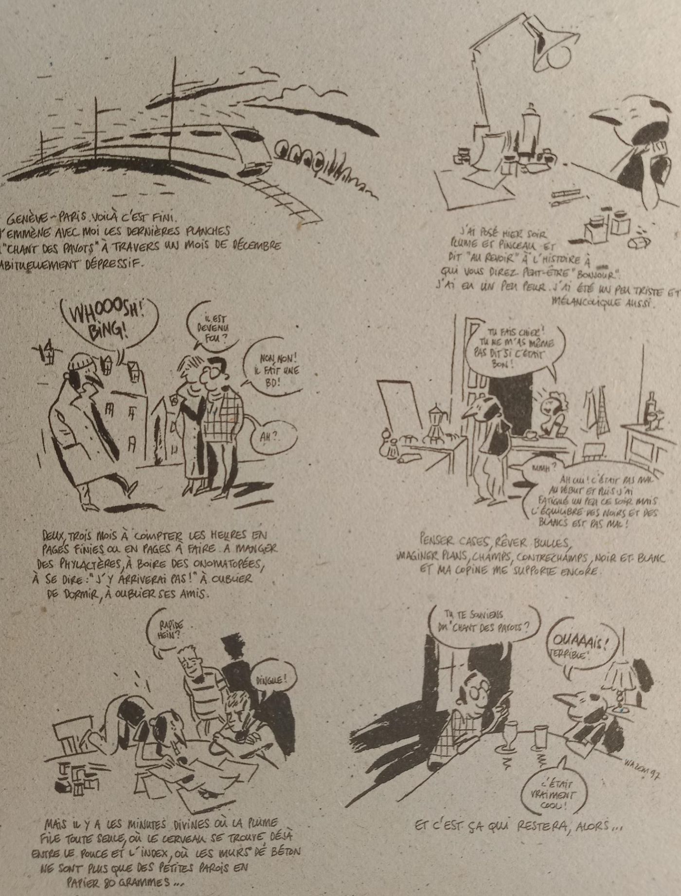 De Lausanne à Venise, en passant par Delémont, Lucerne et Soleure, Pierre Wazem a rendu visite aux différents festivals qui se déroulent dans ces villes et en a ramené toute une série de strips réalisés in situ, des strips qu’Atrabile recueille aujourd’hui dans un format à l’italienne.