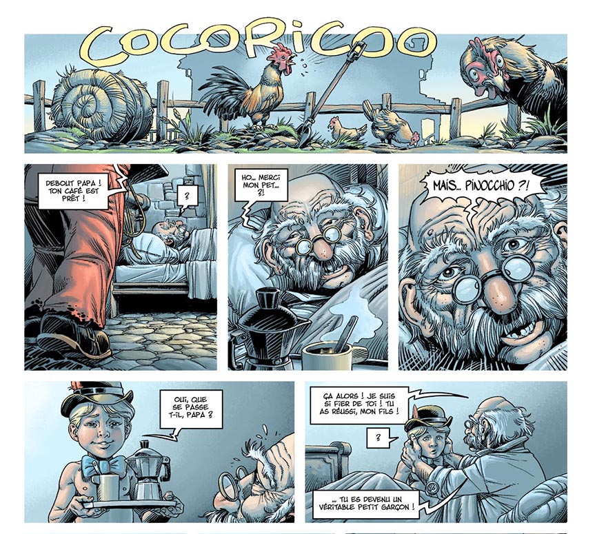 Dernier point, mon dernier album : "Le battement d'aile de papillon" a été diffusé de façon extrêmement confidentielle, pourtant il a, aujourd'hui, presque triplé sa mise en place de départ en ventes francophones. Ce qu'on m'a dit, c'est que la couverture accroche fortement. Ça ne veut pas dire qu'elle est très belle, ça veut dire qu'elle déclenche l'acte de prendre l'album pour voir. Et c'est exactement le même principe que cette nouvelle version de la couv de Pinocchio : un très gros plan de pantin avec une émotion forte, en volume, et très contrasté.