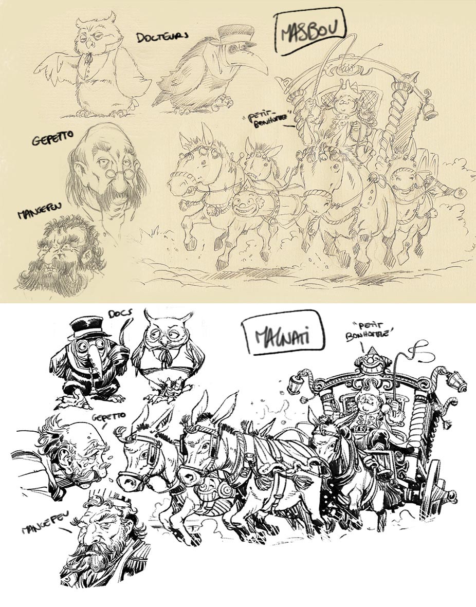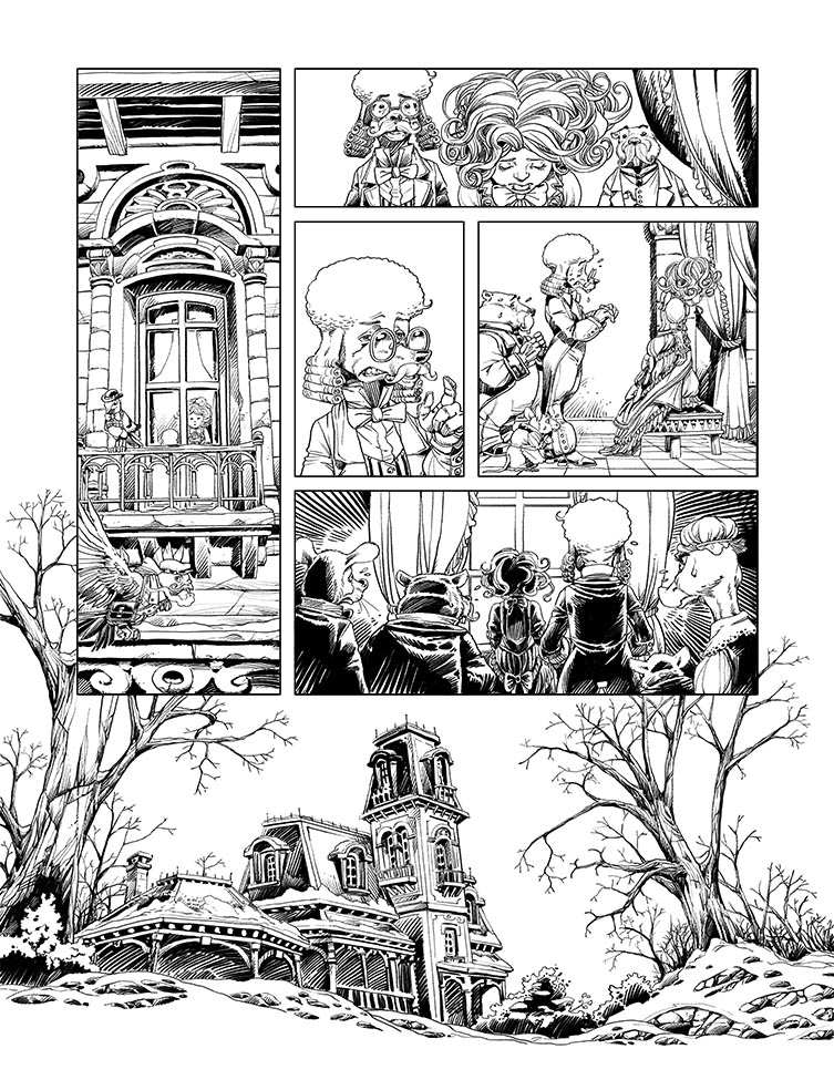 ha tiens si la technique vous intéresse, on a eu une confrontation (amicale) avec jean-Luc, sur la narration. Il travaille à la supervision narrative du projet. Et nous étions en désaccord sur le principe narratif. Lui, il est adepte de la narration en "Z", moi je suis adepte de la narration cinématographique. La narration en Z c'est une narration qui s'appuie sur la dynamique de lecture de la planche, la narration cinématographique s'appuie sur le positionnement des caméras fictives en respectant la ligne des 180°. C'est une ligne fictive qui relie les personnages en interaction. La caméra doit toujours se situer du même côté de la ligne afin de conserver instinctivement un repère spatial pour le lecteur. Je n'aime pas la narration en Z parce que je trouve que ça fait sortir de l'image pour se référer à la planche. MAIS j'admets que ça donne des planches plus élégantes extérieurement, plus agréables à aborder. Donc j'ai décidé de respecter le plus possible CES DEUX narrations. C'est parfois impossible, mais j'essaie. Voici un exemple de compris avec cette planche...