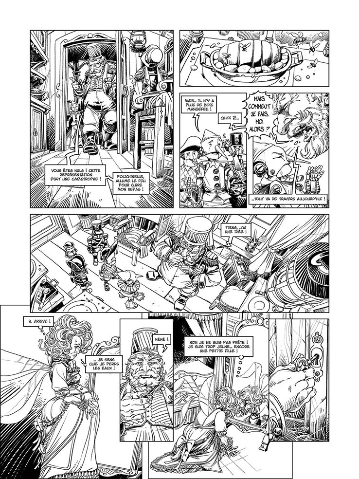 Elle respecte en partie la narration en Z, parce que les cases renvoient par leur dynamique interne à la case suivante, et elle respecte la règle des 180°, parce que la fée est toujours à gauche du miroir, dans toute la séquence, et Mangefeu (le gros barbu) est toujours à droite des marionnettes.