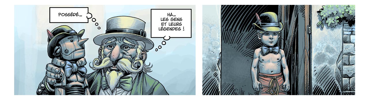 Pour Pinocchio je finis les encrages ce mois-ci, j'en suis très content ! Je fais des tests de couleurs pour la partie "présent" du récit. Il y a le présent où Pinocchio raconte son histoire, et le passé, c'est à dire l'histoire de Pinocchio.
