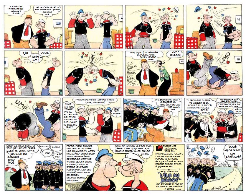 https://www.fnac.com/a21808480/Popeye-S ... sler-SegarOn ne présente plus Popeye, le célèbre et populaire marin apparu en 1929 dans la presse américaine. Après un premier tome paru l'an passé reprenant les pages du dimanche couleur inédites en France à ce jour, un second et ultime volume arrive, complétant ainsi l'intégrale des planches de E.C. Segar, le créateur de cette série. Outre Popeye, Olive Oyl et Wimpy, ce nouveau tome voit l'arrivée d'autres personnages mythiques : Mimosa, Poppa, Eugène le Jeep et La Sorcière des mers. Avec son humour décapant, Popeye est un must have pour tout amateur de bande dessinée classique. Elsie Crysler Segar, salué par Time Magazine, est l'un des grands maîtres fondateurs du 9? art. Pour la première fois, les planches couleurs du dimanche sont réunies en intégrale dans un tirage unique de collection.