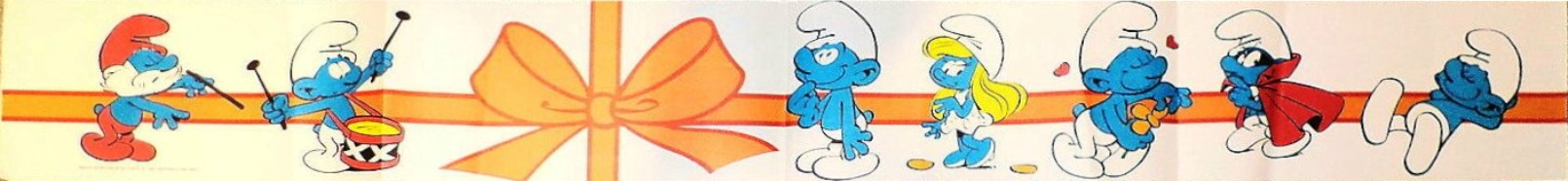 Donc mon hypothèse (à vérifier) serait que la frise 0 et les 12 premiers posters n'auraient au départ pas été numérotés (ce qui expliquerait que la pub dans les Spirou ne parle que des "13 motifs des affiches Schtroumpf" : une frise en format long et 12 posters en format habituel). Je possède en effet 4 visuels d'affiche sans numéro, tous les quatre repris sur la frise 01 (mais la frise 0 était-elle identique??)