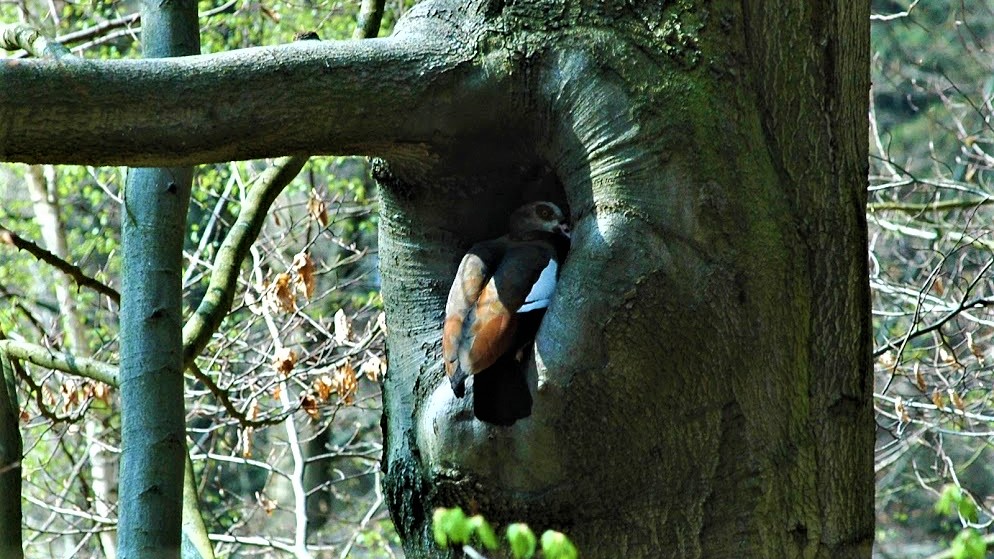 Souviens-toi des dernières photos de hulotte que j'ai postées, celle qui était présente dans une grosse cavité de hêtre. Quelques jours plus tard, je voyais une canne mandarin voler autour de cette cavité, se poster aux abords, visiblement très intéressée.