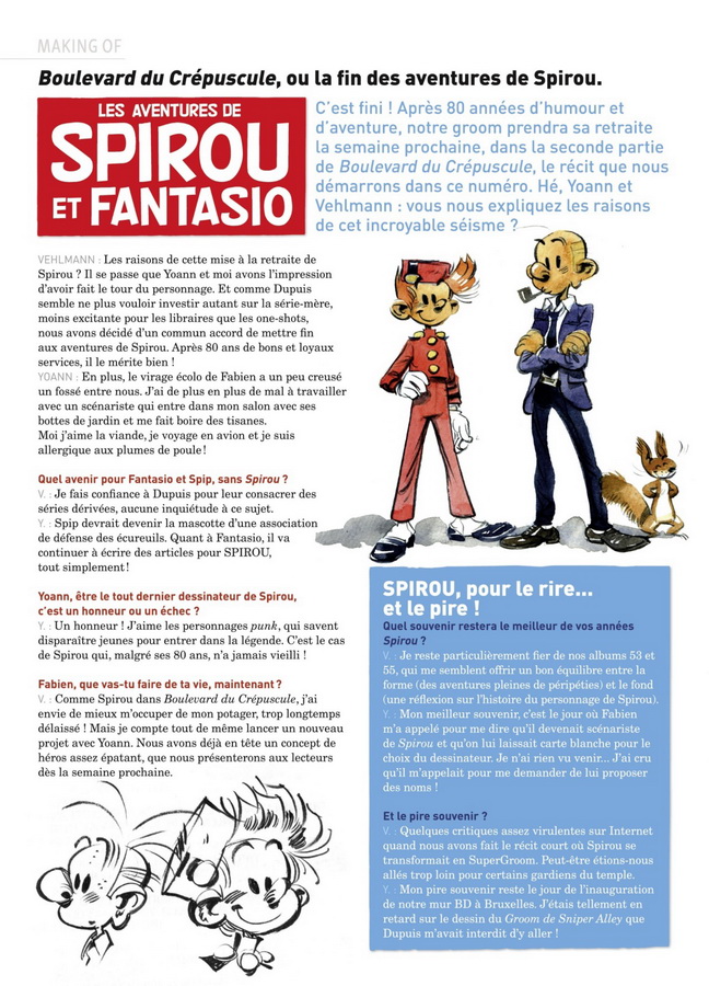 "La série régulière de Spirou s’arrêterait ? Fabien Vehlmann l’annonce dans Spirou et, en riant sous cape, au micro de Claire Chazal dans l’émission Entrée Libre : « Spirou en a marre d’être envoyé tout le temps à l’autre bout du monde », dit-il. Il va souffler un peu, prendre sa retraite."