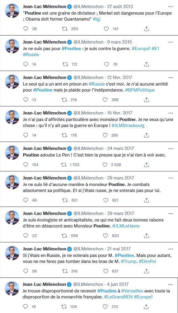 Le Tapir a écrit:La guerre en Europe a complètement relancé les dés...L'ancienne "admiration" de Mélenchon pour Poutine est pas mal relayée dans la presse. C'est une belle épine dans le pied ça! Il a beau faire marche arrière, ça marque mal!