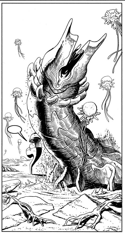 Je crois que Yanzeman est un peu taquin. Difficile de comparer (les styles, les séries) mais je trouve aussi qu'Emem se rapproche plus de l'encrage de Peeters que de celui de Leo. Bref, Renaissance propose des escapades sur la planète Näkän et son bestiaire, c'est juste cool, non ?