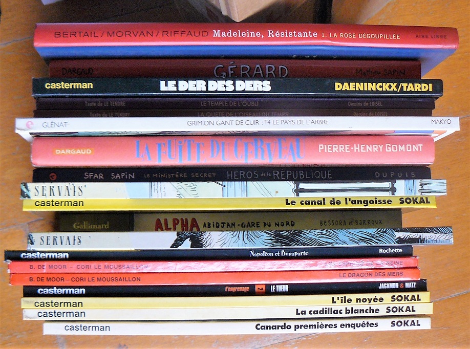 Sinon, un peu de BD, j'en ai laissé beaucoup, content d'avoir trouvé le poster Larousse "Histoire de la BD" complet de ses 32 autocollants. Un gros lot de petits formats, je suis passé tard sur ce stand, le plus gros était déjà parti ! Cela faisait très longtemps que je n'en avais trouvé autant d'un seul coup ! Un peu de figurines aussi du Star wars, Astérix,... cartes postales, fèves et un jeu de 6 assiettes Tintin. Pour terminer un lot de 10 livres très pointus sur l'histoire et la préhistoire, bien que je regarde 3 ou 4 fois toutes les émissions archéologiques qui passent sur toutes les chaînes, je pense que je n'aurai pas le temps de les lire, de toutes façons ils sont bien trop pointus pour moi. Je n'avais jamais vu une bibliothèque avec autant de livres sur l'histoire et la préhistoire, plus de 500 volumes au moins.