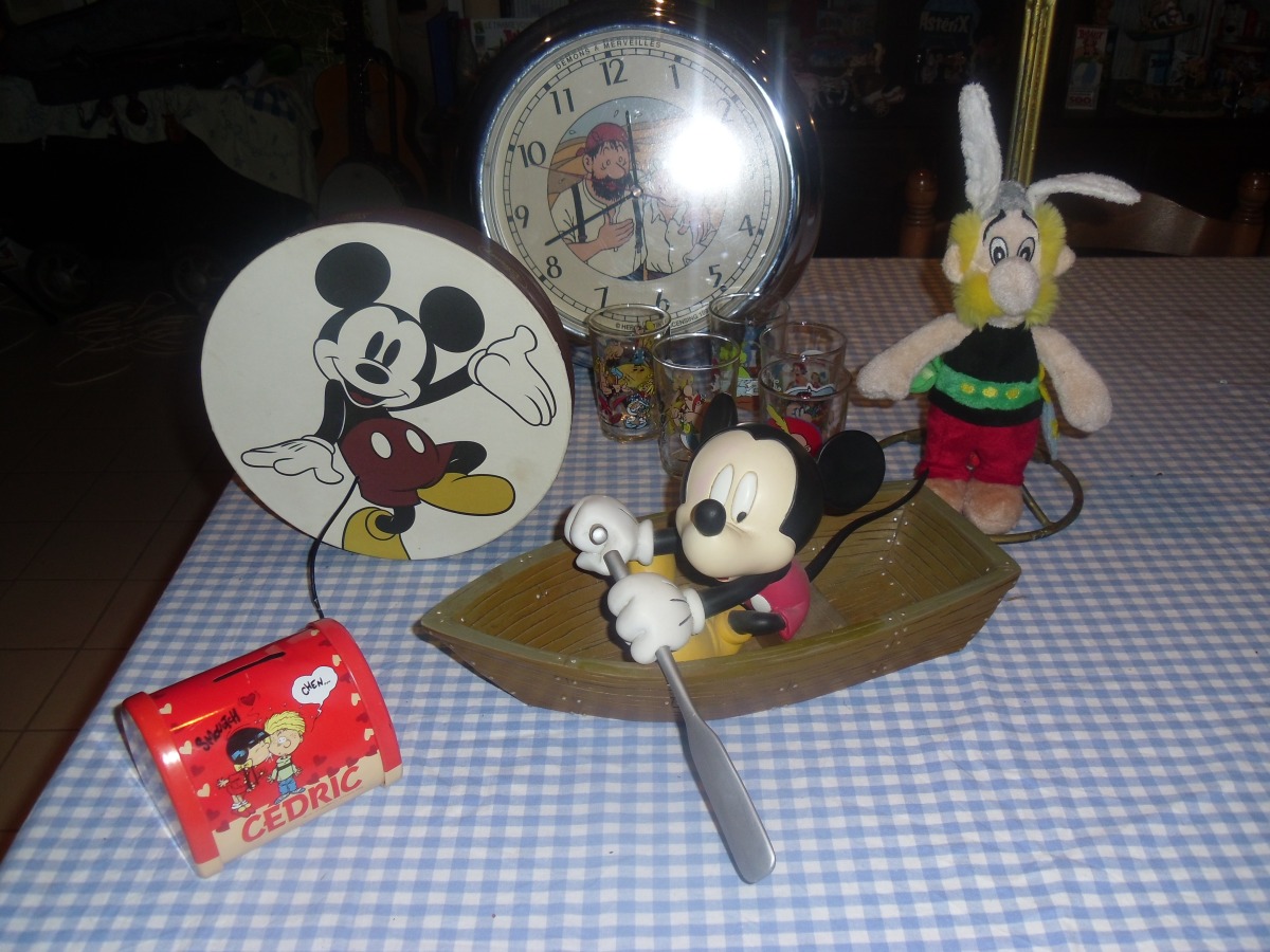 1 peluche Astérix (2005),un Mickey dans sa barque (résine Disney),une boite (vide hélas !) Léonidas Mickey, 1 tirelire Cédric ,1 lot de 6 verres à moutarde , 2 Astérix , 1 Titeuf , 1 Tom et Jerry ,et deux daubes et une superbe pendule Tintin "Démons et merveilles" de 1993 le tout en parfait état !