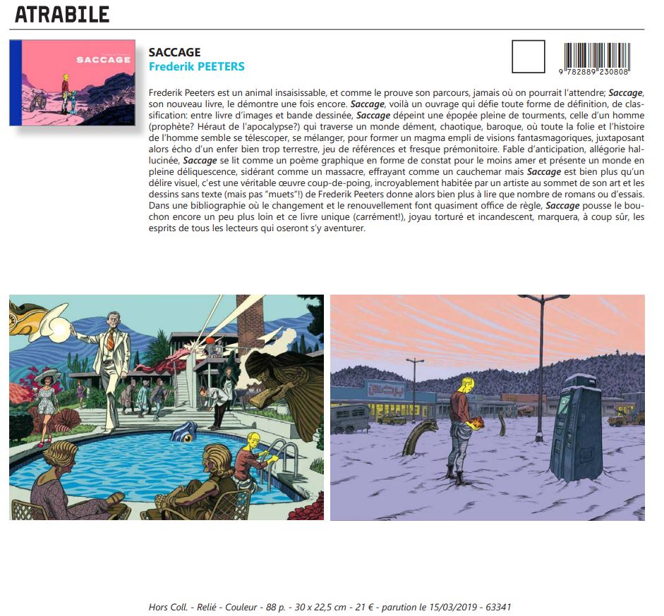 Frederik Peeters est un animal insaisissable, et comme le prouve son parcours, jamais où on pourrait l'attendre ; Saccage, son nouveau livre, le démontre une fois encore. Saccage, voilà un ouvrage qui défie toute forme de définition, de classification : entre livre d'images et bande dessinée, Saccage dépeint une épopée pleine de tourments, celle d'un homme (prophète ? Héraut de l'apocalypse ?) qui traverse un monde dément, chaotique, baroque, où toute la folie et l'histoire de l'homme semble se télescoper, se mélanger, pour former un magma empli de visions fantasmagoriques, juxtaposant alors écho d'un enfer bien trop terrestre, jeu de références et fresque prémonitoire. Fable d'anticipation, allégorie hallucinée, Saccage se lit comme un poème graphique en forme de constat pour le moins amer et présente un monde en pleine déliquescence, sidérant comme un massacre, effrayant comme un cauchemar mais Saccage est bien plus qu'un délire visuel, c'est une véritable oeuvre coup-de-poing, incroyablement habitée par un artiste au sommet de son art et les dessins sans texte (mais pas «muets«!) de Frederik Peeters donne alors bien plus à lire que nombre de romans ou d'essais.