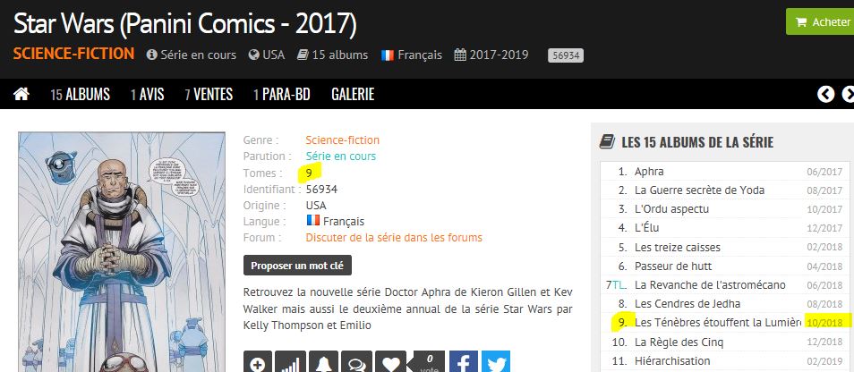 Keorl a écrit:J'ai remarqué un truc très bizarre hier : sur une série avec un nouvel album (La Fille des Cendres), le nouvel album n'apparaissait pas. Tiens, bizarre. Tant que j'étais sur la page de la série, j'en profite pour voter. Je n'étais pas connecté ... du coup je le fais. Boum, le nouvel album est là, et sa fiche est indiquée créée depuis janvier.