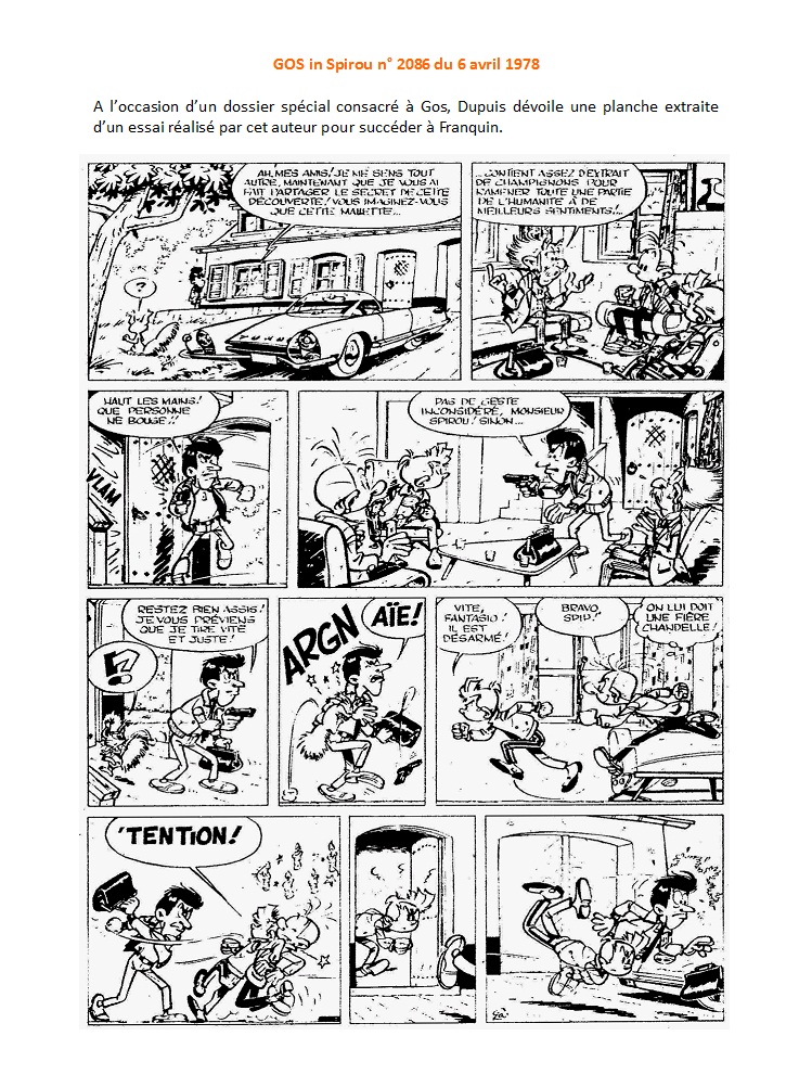 Lorsque Franquin décide d'abandonner la série Spirou et Fantasio, Gos fait partie des dessinateurs pressentis pour reprendre la série. Il en dessine quelques planches mais finalement ne la reprend pas