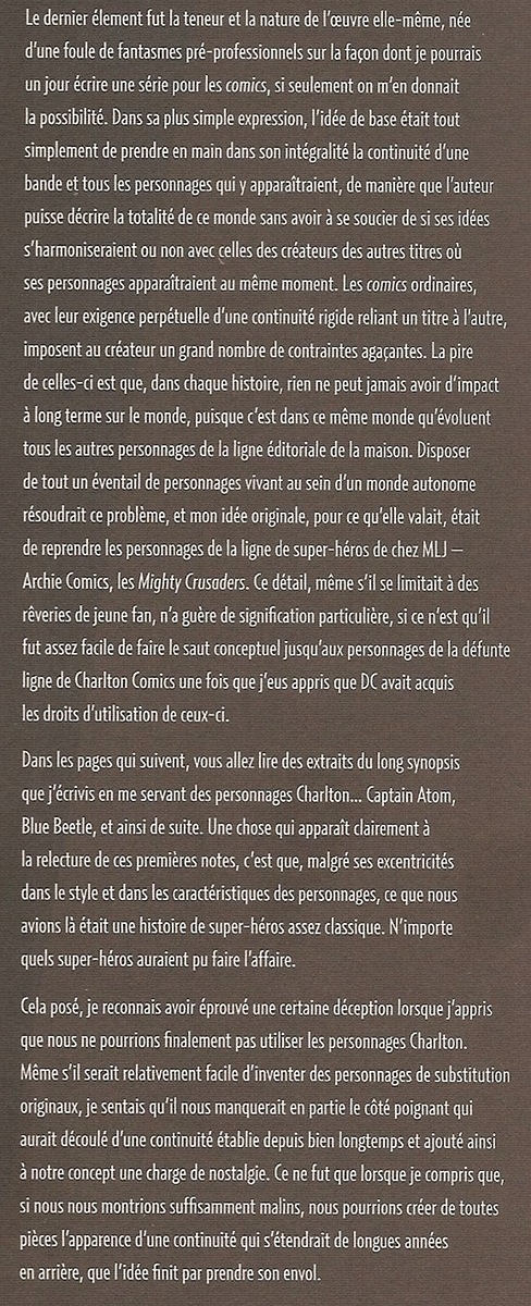 Le côté "création collective" (/ industrielle) de l'univers des comics a toujours posé problème à Moore quand il bossait pour DC, avec les limitations à la singularité de l'œuvre et à la liberté artistique qu'impose le fait d'inscrire son histoire dans une continuité qu'on ne maîtrise pas, et donc d'être limité par elle... C'est d'ailleurs ce qui l'a poussé à écrire Watchmen.