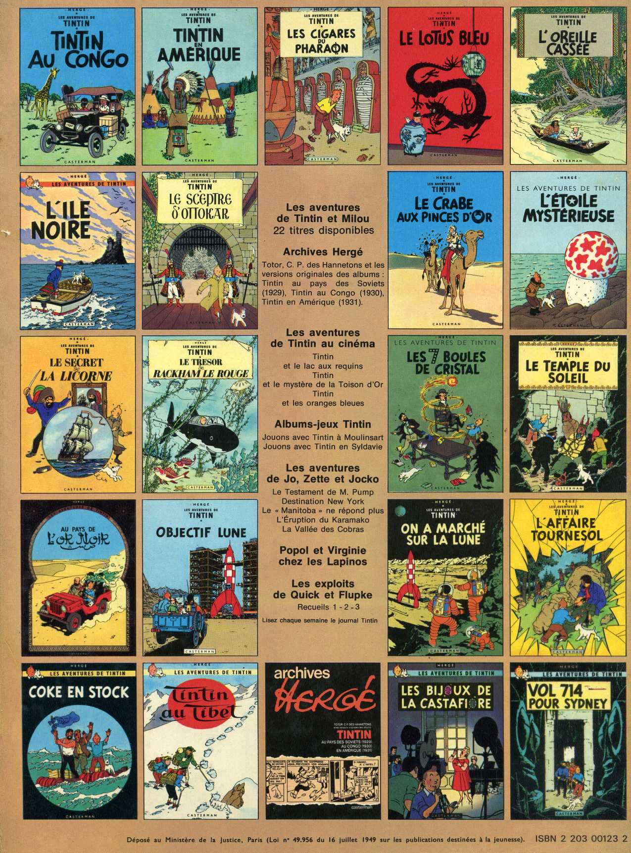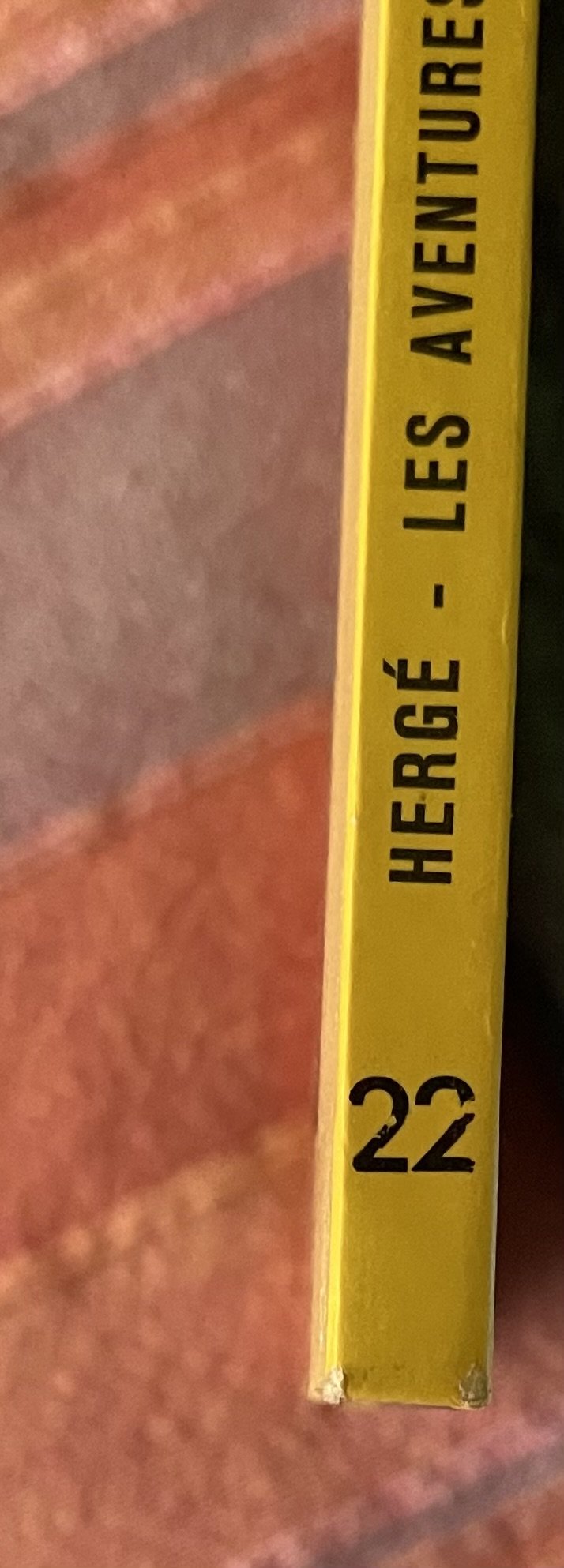 le 4 de couv est identique sur mes deux exemplaires mais sur la tranche jaune en bas avant Hergé , j'ai le numéro 22 imprimé, or c'est bien le 23 de la série. j'en viens à la conclusion suivante, c'est un précédent lecteur qui aurait numéroté lui même ses albums? qu'en pensez vous