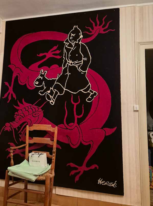 Tapis en laine Axis en parfait état figurant Tintin et Milou sur le dragon, France 1996. Dimensions : 165 x 230 cm. Extrêmement décoratif en exposition murale.