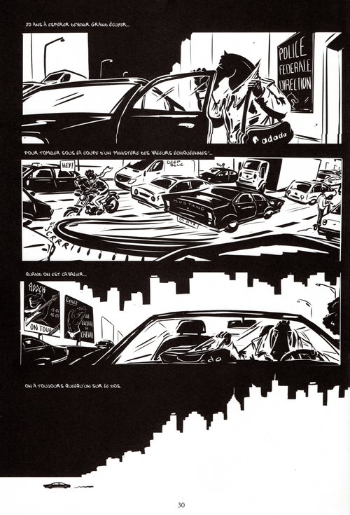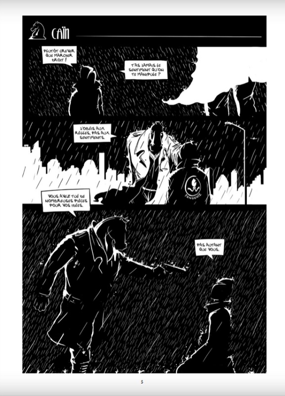Un Monde en Pièces est une saga politique-sociale noire, qui transpose notre actualité sur un gigantesque plateau d’échecs et est publiée aux éditions Presque Lune le 28 juin 2018. Nous suivons une partie se déroulant sur plusieurs tomes, entre intrigue politique, chasse à l’homme, histoire d’amour et montée du totalitarisme. Le ton emprunte au roman noir, servi par un graphisme en noir et blanc de circonstance.