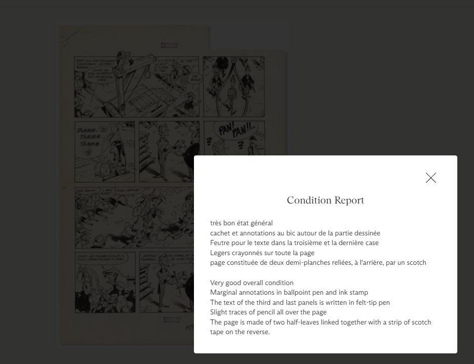 Morris arrête d'indiquer les couleurs au dos à partir de Pied-tendre en 1967 (voir lot 35) au moment où il confie la mise en couleurs à Leonardo. C'est l'époque où émergent le métier de coloriste et la technique des "bleus de coloriage"