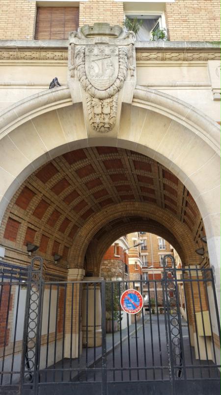Le blason et la devise de Paris sur l'entrée d'une cours d'immeuble.