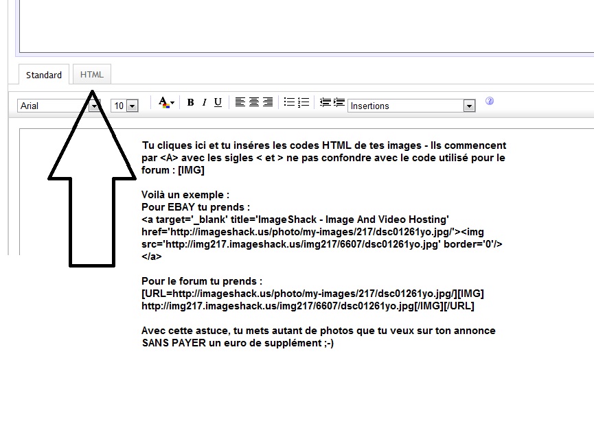 Pour ceux qui ne le savent pas, vous pouvez mettre autant de photos que vous souhaitez et ce gratuitement, il suffit de se mettre en mode HTML dans la description de l'objet et la insérer toutes les tofs a partir d'un hébergeur.
