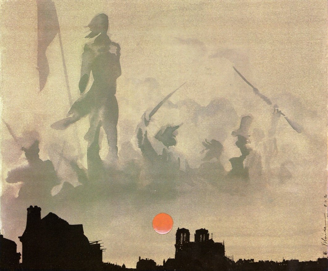 On remarque la similitude de la forme du tas de bois aux pieds de Julie, avec celle du tas de corps blessés, décédés aux pieds de Marianne :